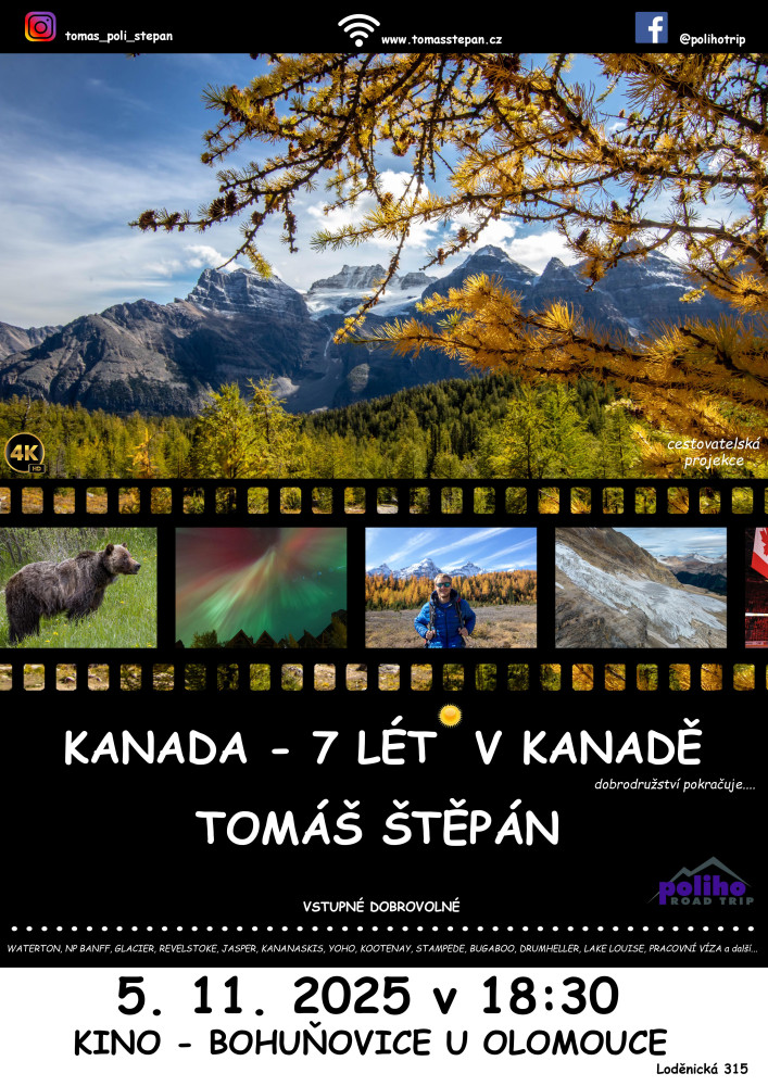 Předáváme pozvánku na cestovatelskou projekci KANADA - 7 LÉT V KANADĚ, kterou můžete shlédnout 5. 11. 2025 v 18:30 v bohuňovickém kině.