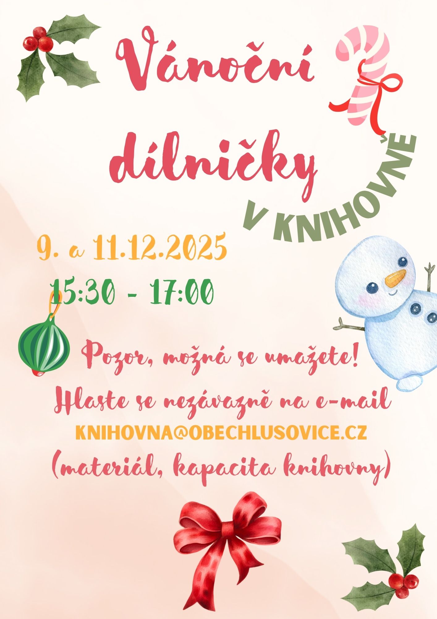 Vánoční dílničky proběhnou 9. a 11. 12. 2025 15:30-17:00. Svůj zájem hlaste opět na e-mail, z důvodu kapacity a materiálu.