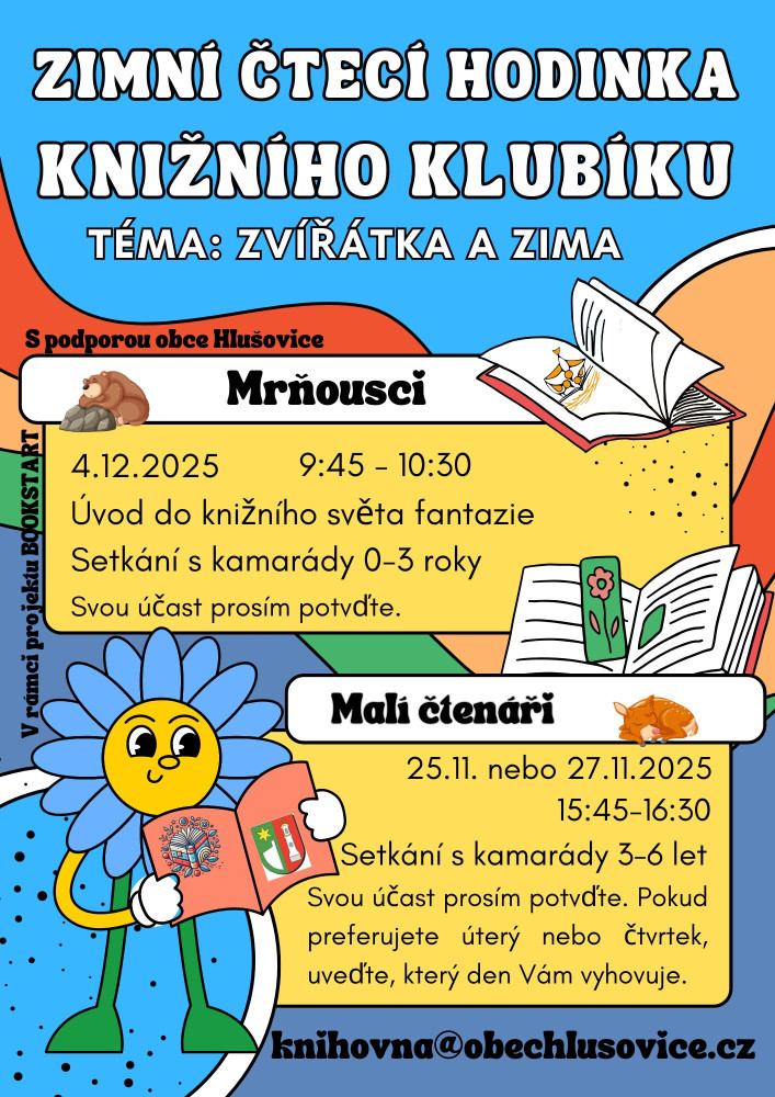 Další hodinka knižního klubíku pro děti 3 až 6 let proběhne 25. a 27. 11. 2025 v obvyklém čase 15:45 až 16:30.