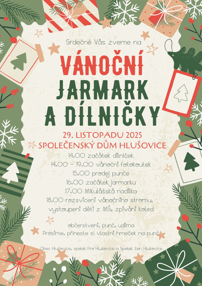 dovolujeme si vám připomenout Vánoční jarmark a dílničky, které se uskuteční v sobotu 29. 11. 2025 od 14 hod. v Kulturním domě v Hlušovicích. Program naleznete v příloze.