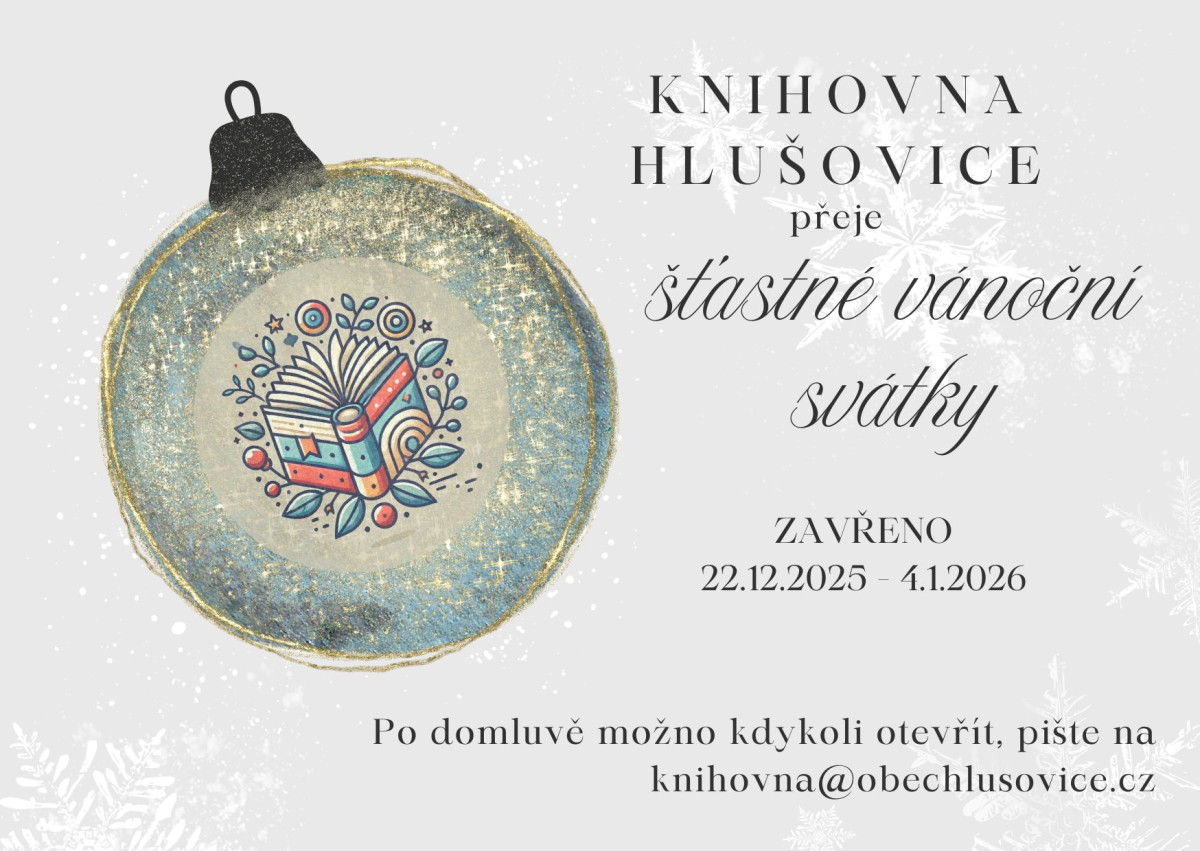 Od jara fungují webové stránky knihovny https://mistni-knihovna-hlusovice.webnode.cz a máme možnost půjčení e-knih a audioknih z pohodlí domova v aplikaci Palmknihy. Tuto možnost můžete využít kdykoli z domu, návod jak na to, najdete na webu i Facebooku knihovny. Knihovna bude od 22. 12. 2025 do 4. 1. 2026 zavřená, ale kdyby vám došlo čtení, můžete se domluvit individuálně na knihovna@obechlusovice.cz.