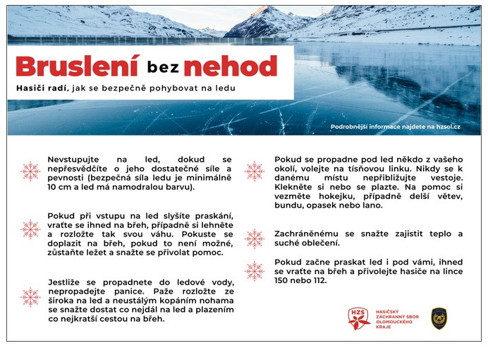 díky teplotám hluboko pod nulou zamrzají vodní plochy v celém kraji a lákají veřejnost k ledním radovánkám. Rádi bychom proto připomenuli základní pravidla, jak se na ledu pohybovat, aby nedošlo k nebezpečným situacím. A když k nim dojde, přinášíme pár rad, jak se v nich zachovat.