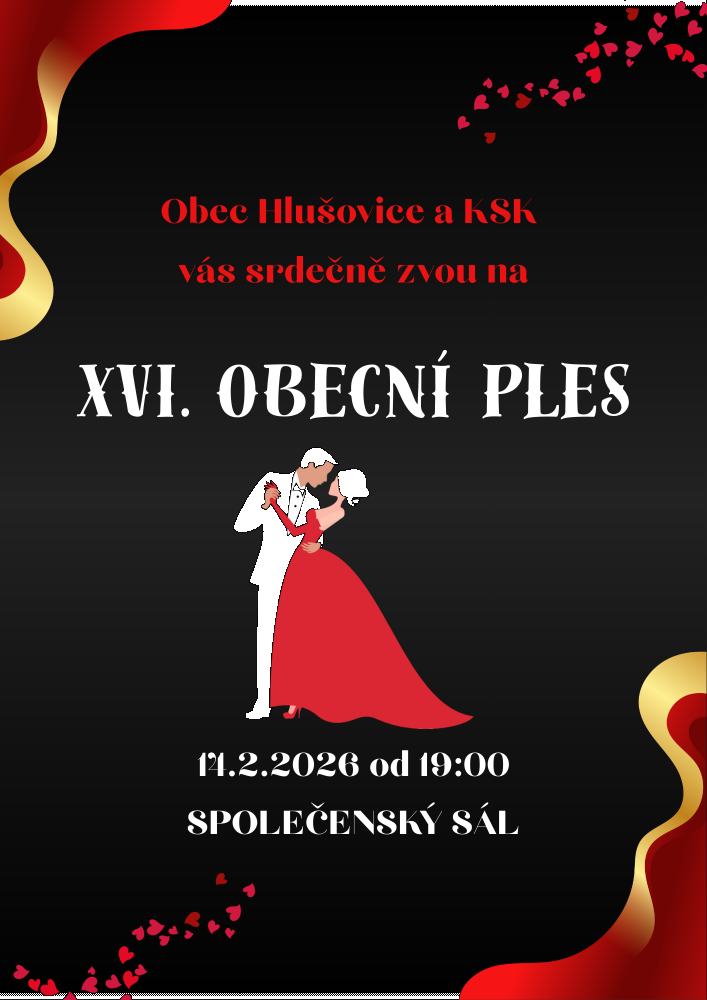 srdečně vás zveme na XVI. Obecní ples, který se bude konat 14. 2. 2026 od 19:00 v kulturním domě v Hlušovicích. Hraje kapela Iantar. Občerstvení zajištěno.