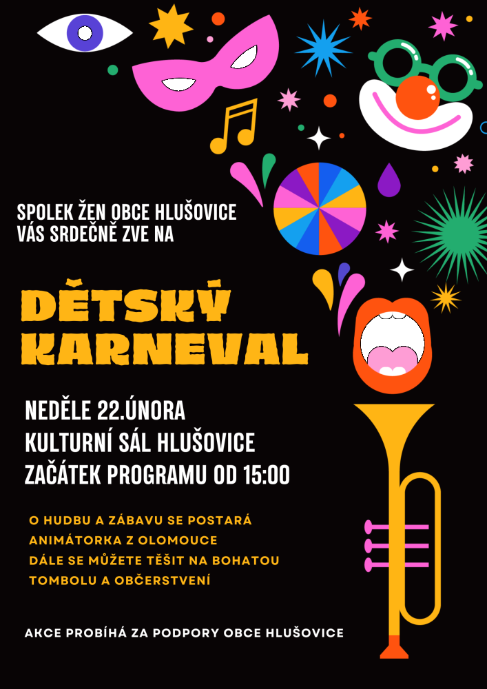 dovolujeme si připomenout, že v neděli 22. února 2026 od 15 hod. se koná Dětský maškarní karneval, a to kulturním domě v Hlušovicích.