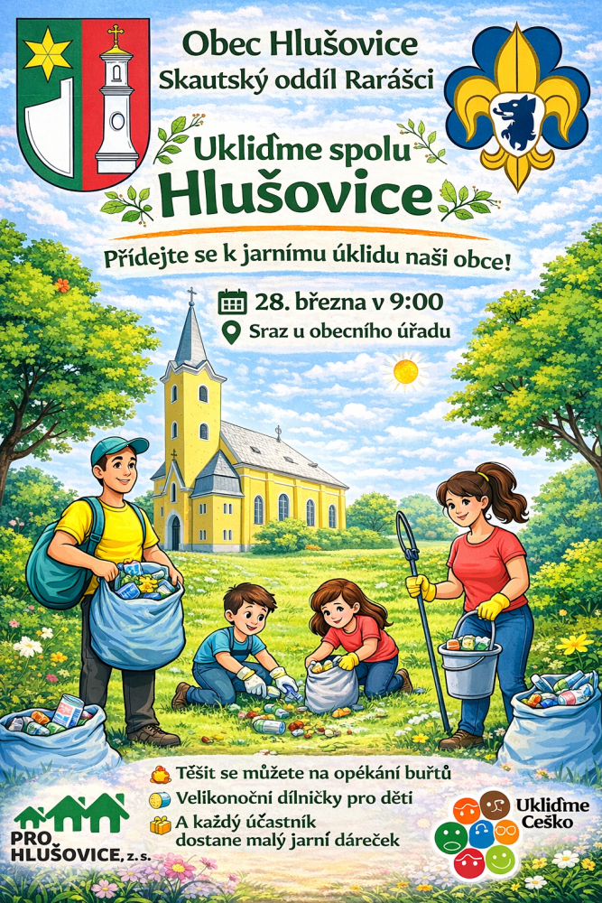 Obec Hlušovice, PRO HLUŠOVICE, z.s. a skautský oddíl Rarášci vás srdečně zvou akci "Ukliďme spolu Hlušovice", která se uskuteční 28. 3. 2026 od 9:00, sraz bude u Obecního úřadu.