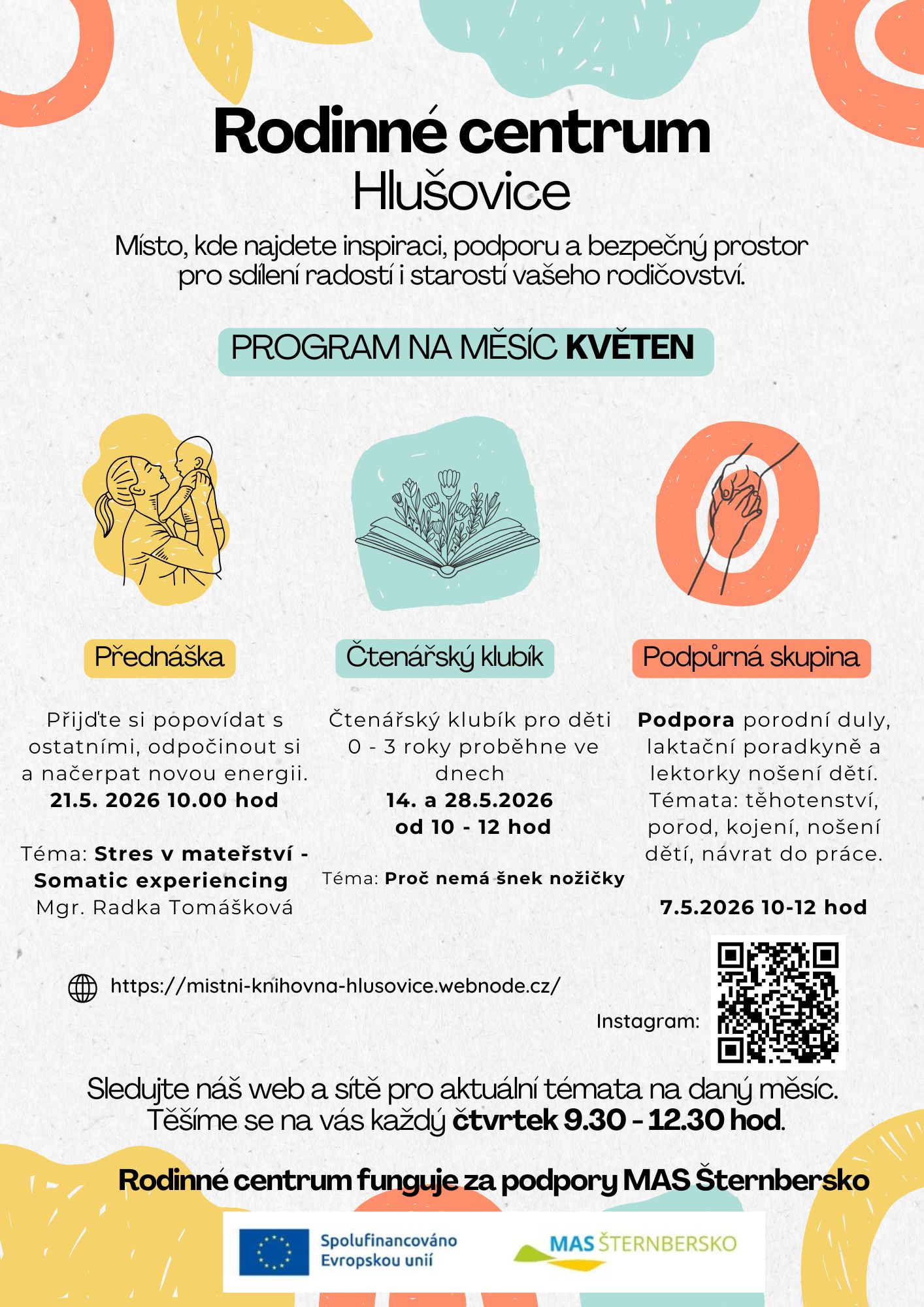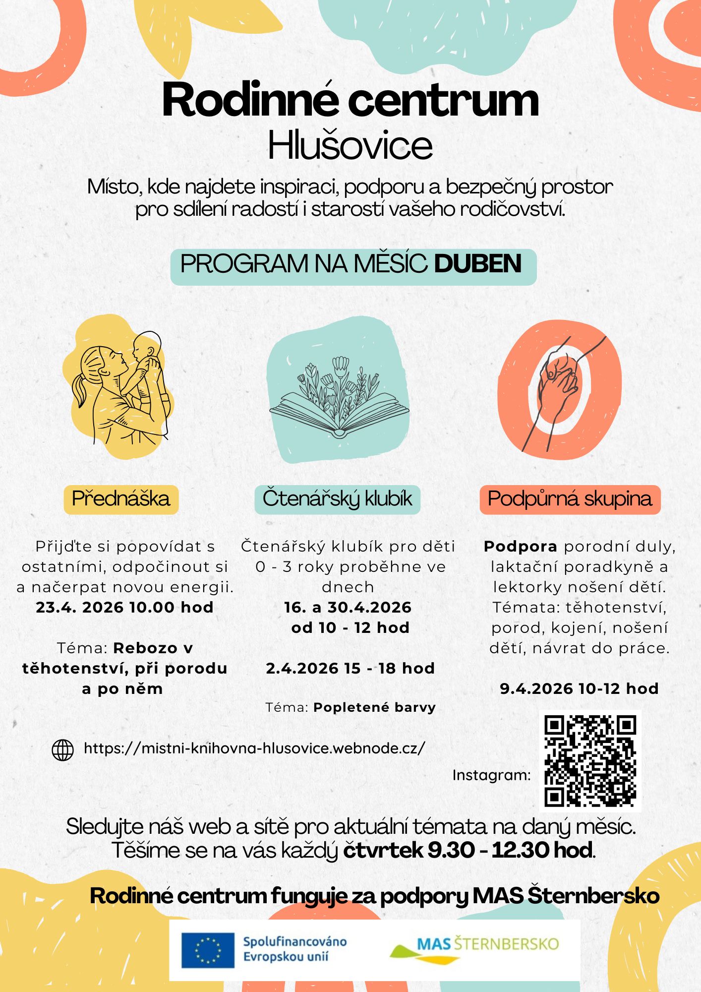 Na programu se střídá čtenářský miniklubík s odbornou přednáškou nebo podpůrnou skupinou. V příloze zasíláme program na duben a květen.